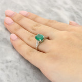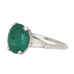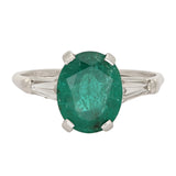 Flanking the centre stone are two tapered baguette diamonds to frame the emerald with balanced sparkle. Set in platinum, the clean lines of the band and traditional setting place full emphasis on the striking contrast between the central stone and the crisp white diamonds.