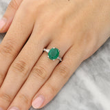 A lovely three-stone ring centred on a vibrant oval-cut emerald, its rich green hue alive with character and depth. The gemstone’s luminous colour is beautifully showcased by a classic claw setting, allowing light to pass through and enhance its vivid brilliance.