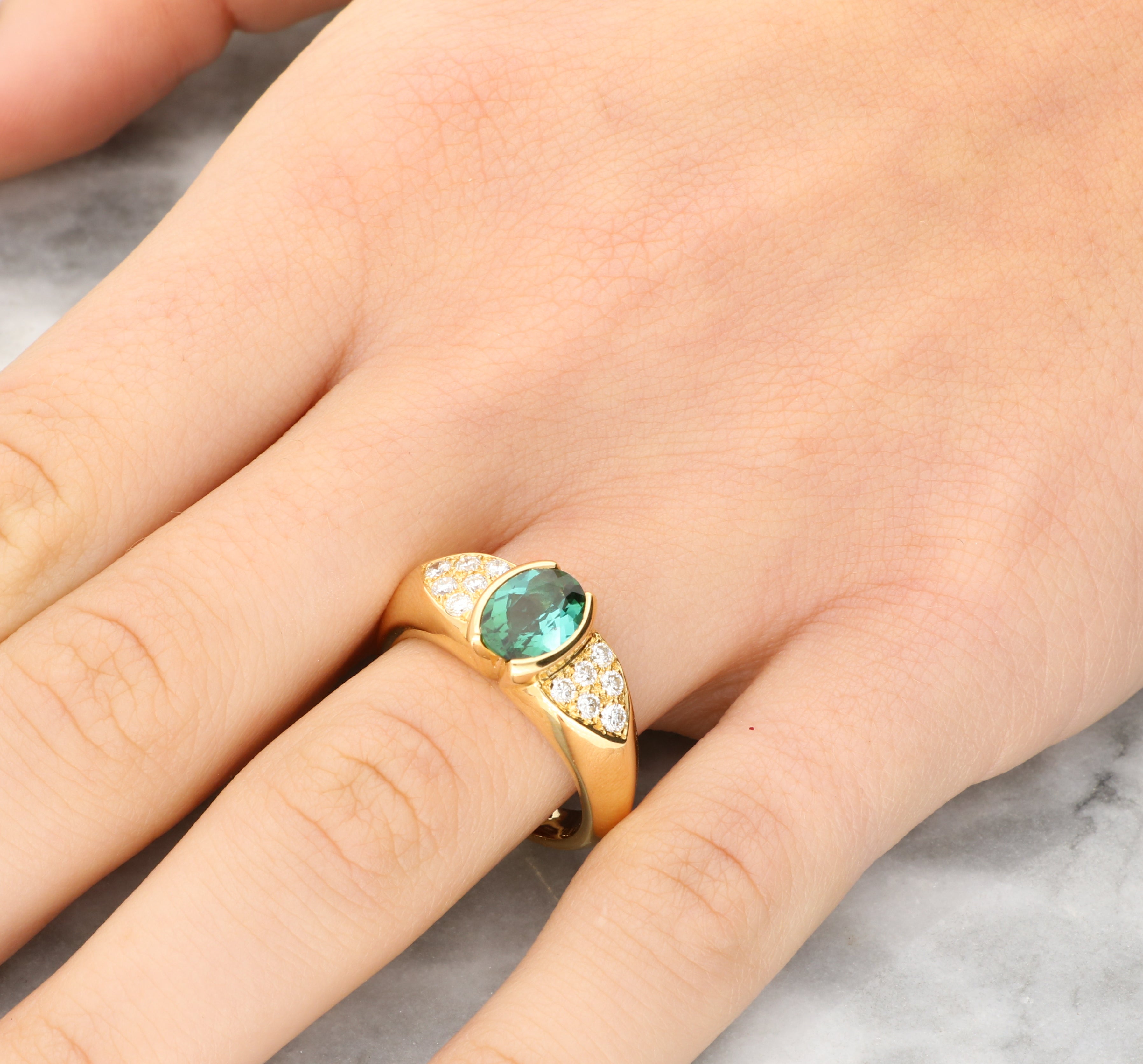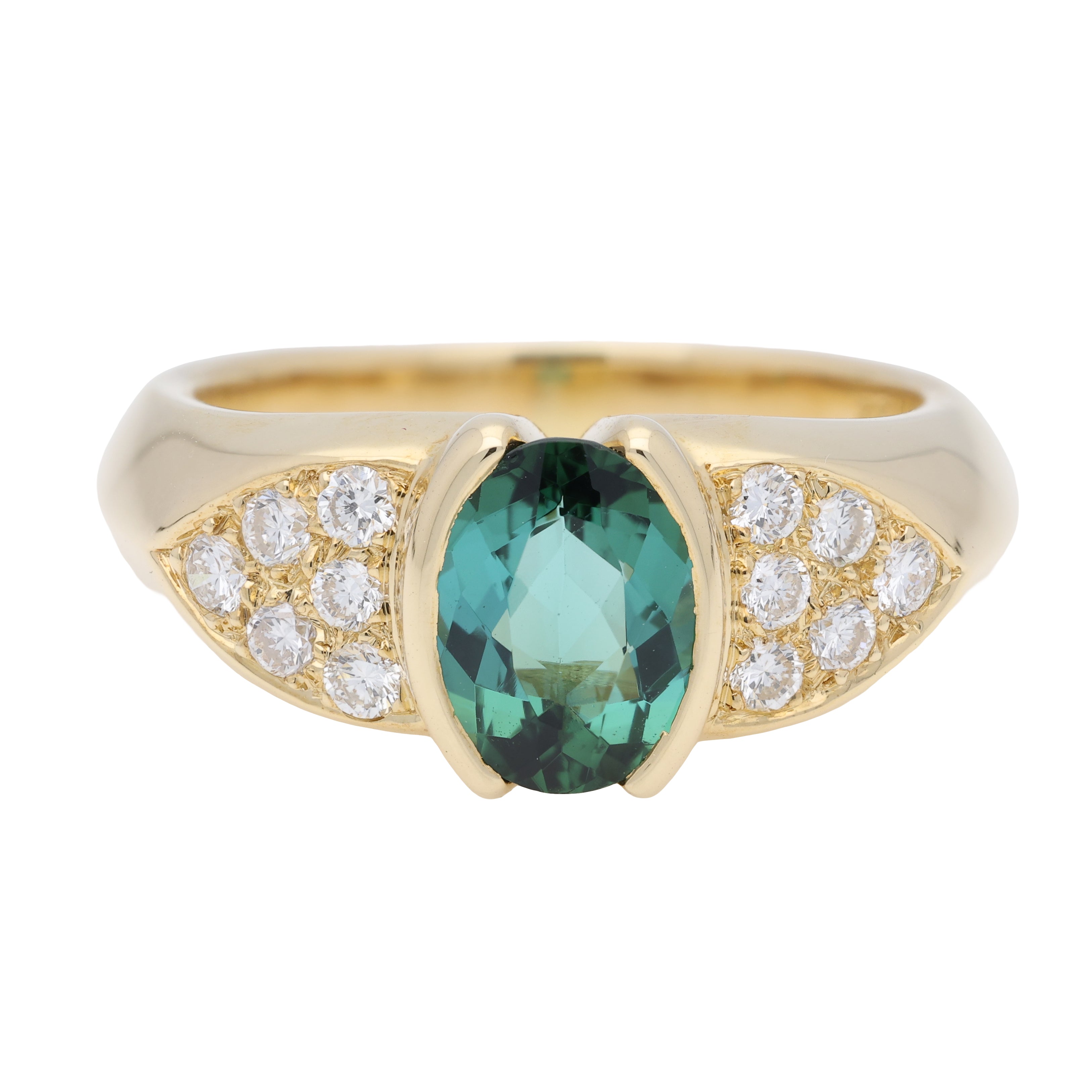 The ring centrally features a beautiful oval cut green tourmaline, securely bezel set in 18ct yellow gold. The tourmaline is sided by a triangular motif set six round brilliant cut diamonds either side. The head of the ring leads to a solid chunky gold band.