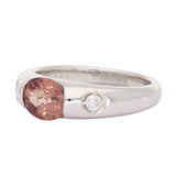 A lovely three-stone ring centred on an oval-cut peach sapphire, its warm blush tones glowing with soft, sunset-like radiance. The gemstone displays a captivating mix of rosy pink and delicate champagne hues, shifting subtly as it catches the light.