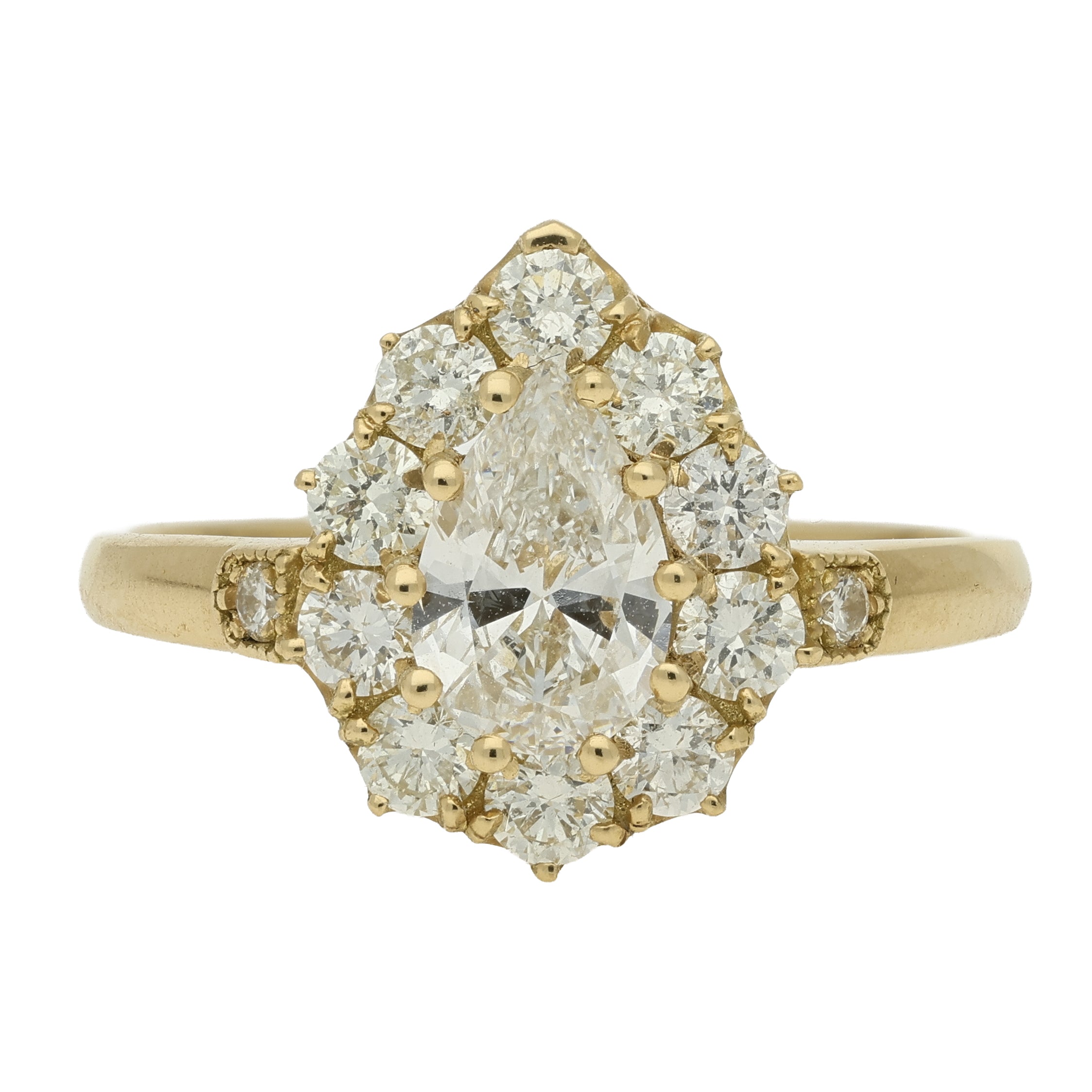 The ring centres on a pear shaped diamond, securely set in 18ct yellow gold claws and framed by a surrounding cluster of round brilliant cut diamonds. The halo follows the contour of the central stone, enhancing its shape while adding additional sparkle.