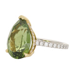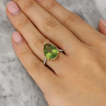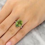 A striking design centred on a beautiful pear-cut peridot, its fresh olive-green hue glowing with vibrant clarity. The facets of the stone catch the light effortlessly, revealing flashes of golden-green brilliance with every movement.