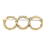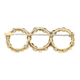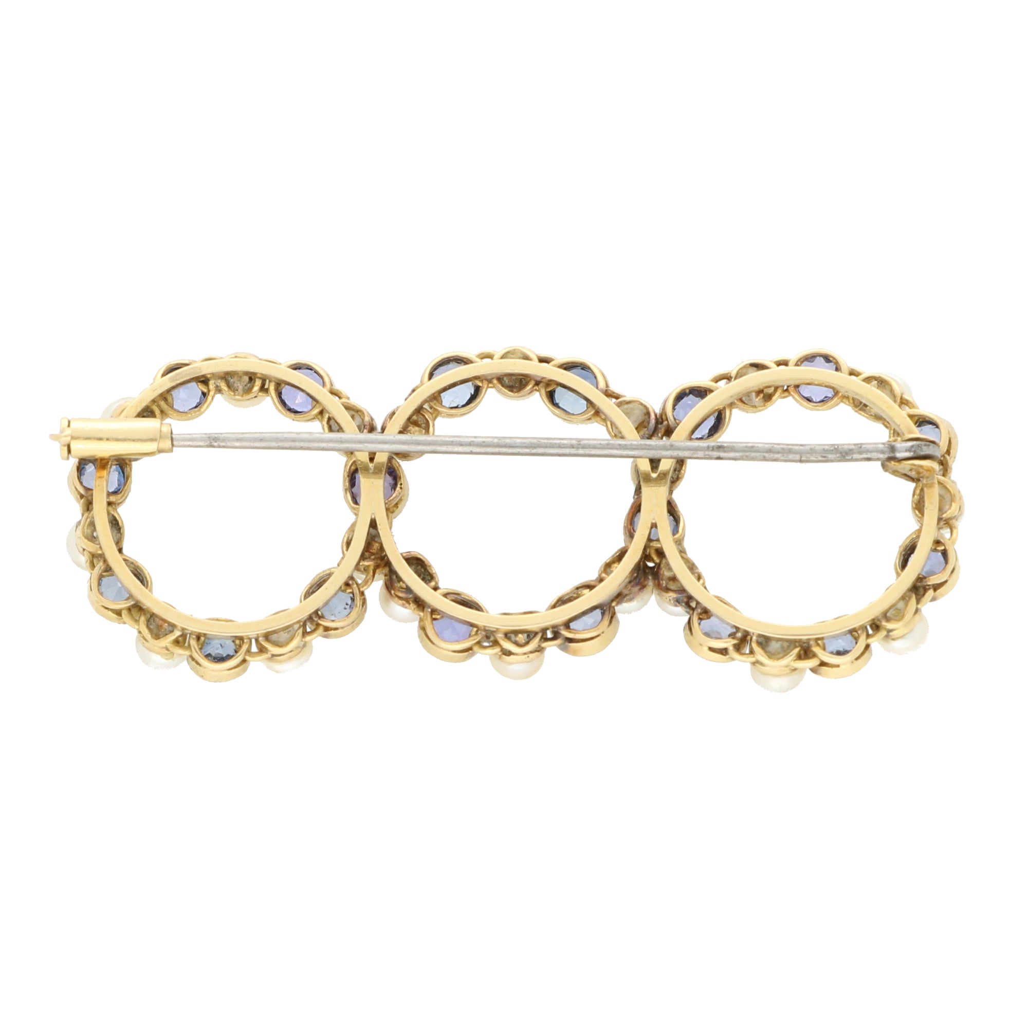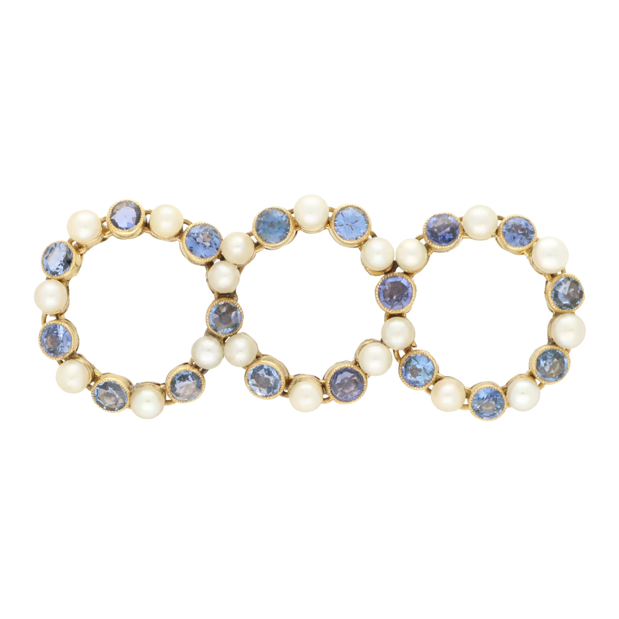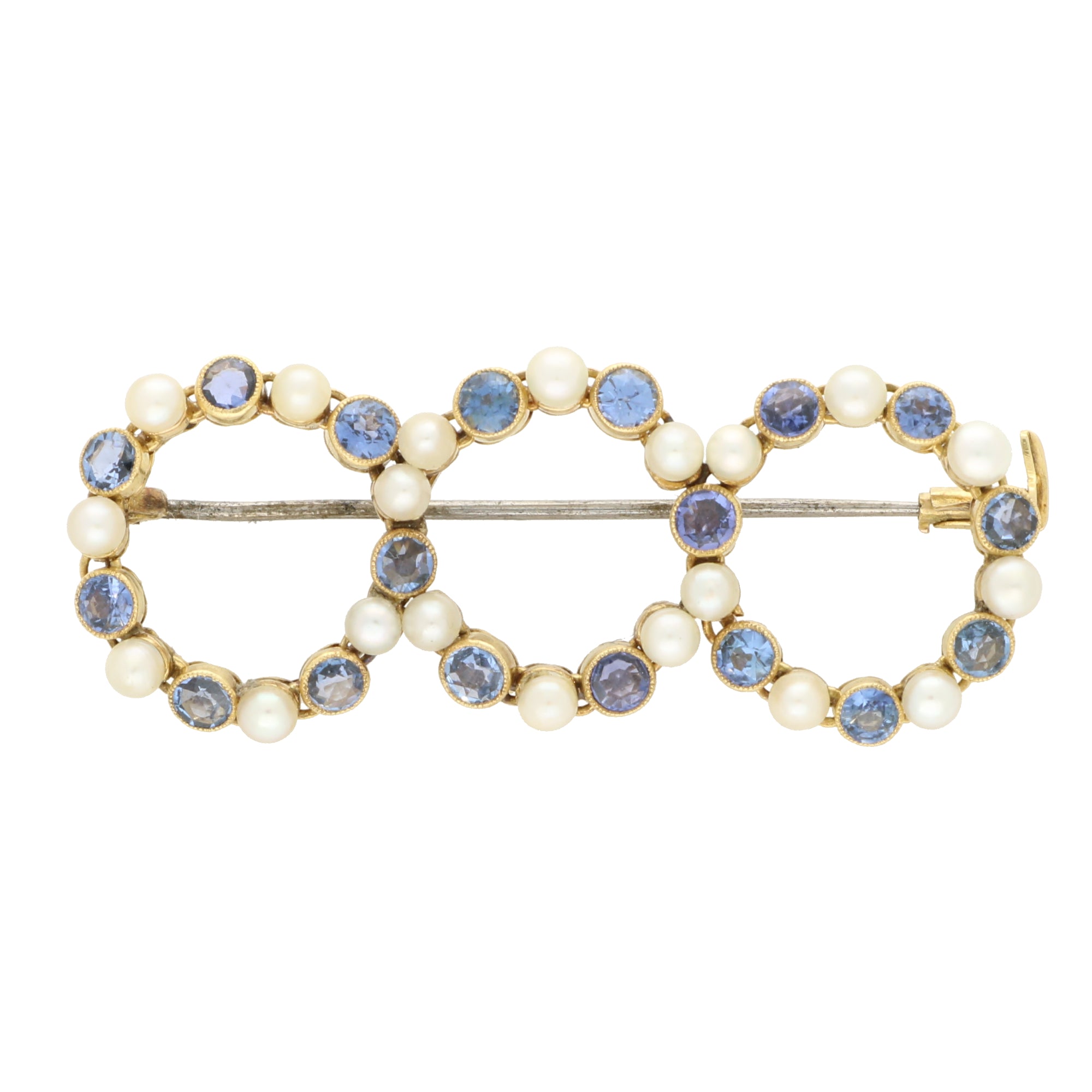 The brooch is composed of three intertwined circle motifs which are set with button pearl and natural blue sapphires. The brooch is secured to reverse with a pin and roller clasp fitting.