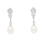 These elegant earrings feature a decorative diamond top section, each diamond is rubover and milgrain set for a vintage look. From this setting suspends a delicate trefoil motif of three rubover set diamonds, leading to a single rubover set diamond from which hangs a beautiful white pearl drop. The pearls have a lovely soft lustre, perfectly complementing the sparkle of the diamonds. The earrings are fitted with post and butterfly fittings for secure and comfortable wear.