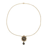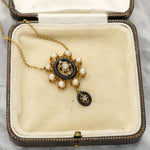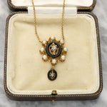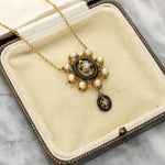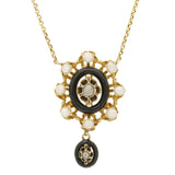 This striking pendant necklace features an ornate floral design crafted in 18K yellow gold, centred with a rose-cut diamond set within a delicate flower motif. A bold black enamel oval frame surrounds the central cluster, creating a dramatic contrast against the warm gold tones. The outer border is adorned with luminous white pearls accents arranged in a symmetrical pattern, enhancing the piece’s antique charm. A matching enamel drop, also set with a rose-cut diamond, suspends gracefully below the main panel.