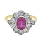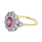 A pink sapphire and diamond cluster ring set in 18k yellow gold and platinum.