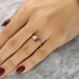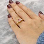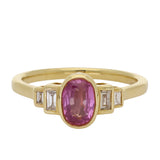 This lovely ring is centred on a vibrant oval-cut pink sapphire, bezel-set in 18K yellow gold to enhance its rich colour and smooth, refined outline. Flanking the centre stone are tapered baguette-cut diamonds, also bezel-set, adding brilliance and creating a harmonious five-stone composition.