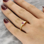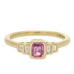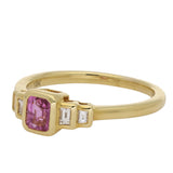 This lovely ring is centred on an emerald-cut pink sapphire, bezel-set to enhance its rich colour and clean, architectural lines. The smooth gold surround frames the gemstone beautifully. Flanking the centre stone are tapered baguette-cut diamonds, also bezel-set, adding crisp brilliance and symmetry to the design.