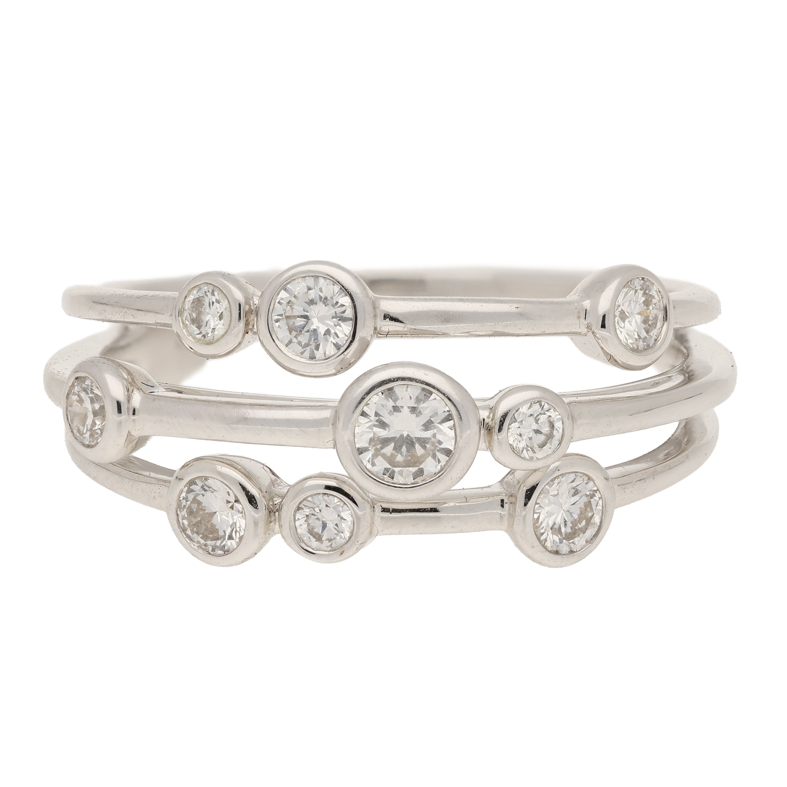 The ring is composed of three soldered solid white gold bands which are scattered with rub over set diamonds. The setting of the stones gives a bubble like feeling to the overall design, making it a fun piece to wear. All the stones vary ever so slightly in size creating a beautiful contrast on the finger.