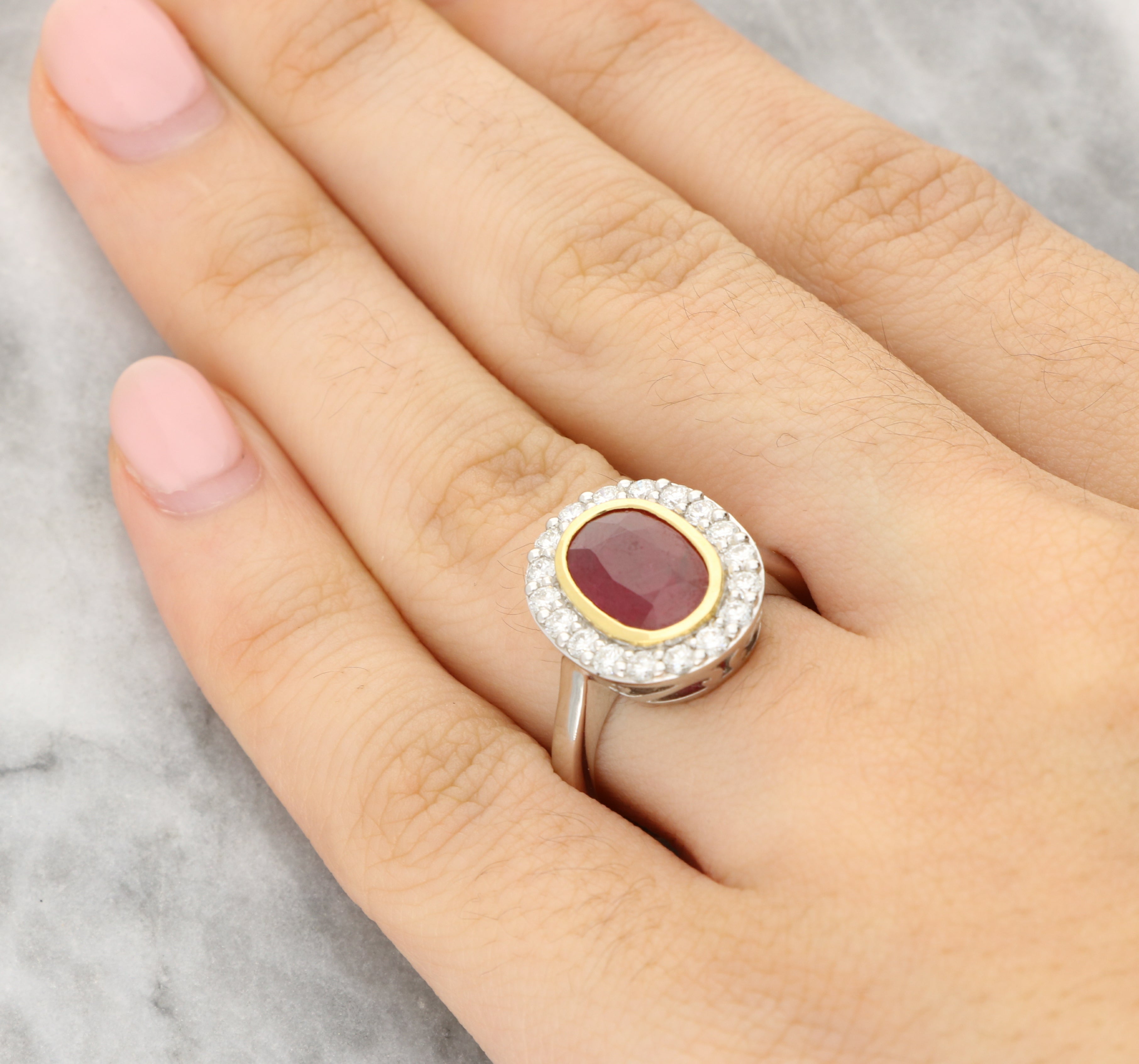 A beautiful cluster ring showcasing an oval-cut ruby at its heart. As the light catches its facets, flashes of crimson shimmer across the surface, giving the stone a rich depth that draws the eye instantly. Framing the ruby is a generous surround of round brilliant-cut diamonds, individually set to create a continuous circle of light.