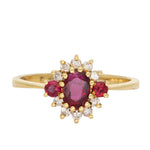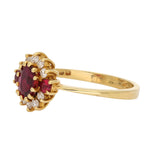 Encircling the centre stone is a halo of round brilliant cut diamonds forming a delicate floral cluster. Additional rubies sit to each side, adding balance and enhancing the overall symmetry. The fine yellow gold band keeps the focus on the gemstones while giving the piece a warm, traditional vintage character.