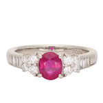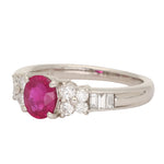 This beautiful ring features a vibrant oval cut ruby centrally set in a classic claw setting. The ruby is flanked on either side by clusters of brilliant round cut diamonds, with additional tapered baguette cut diamonds set into the shoulders, creating a graceful taper and enhancing the sparkle across the band. The combination of cuts gives the ring depth, light and refined symmetry.