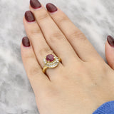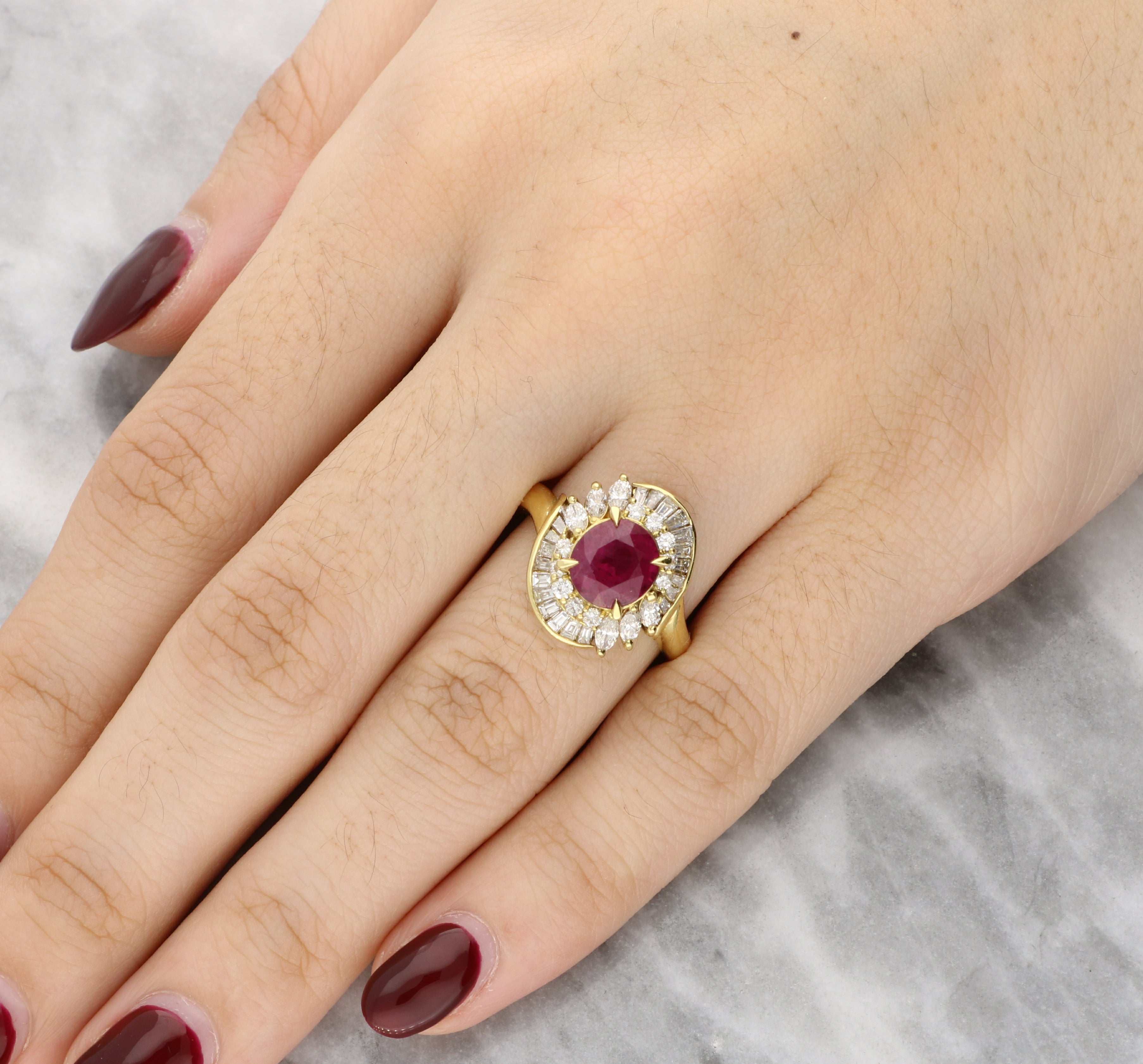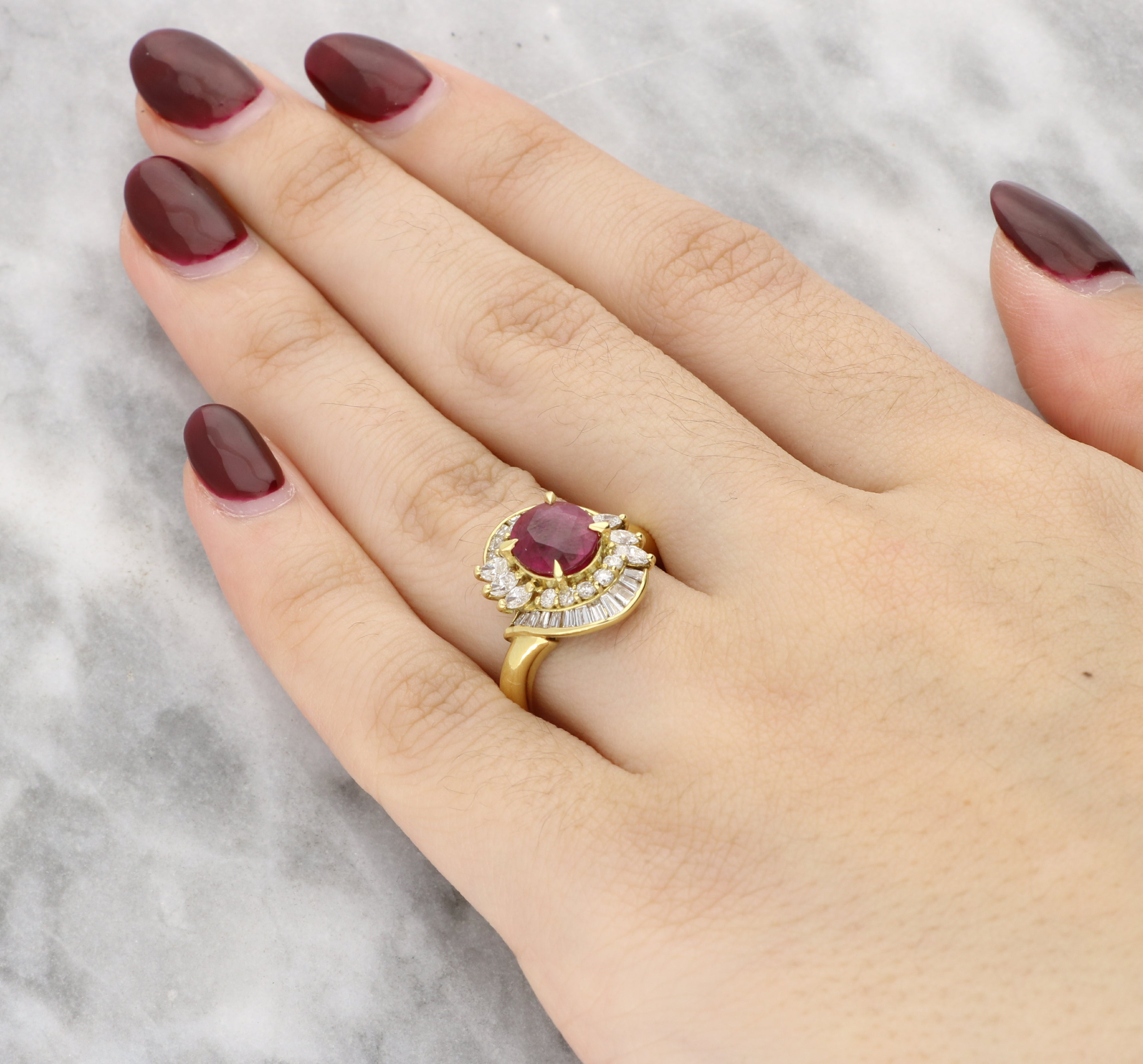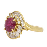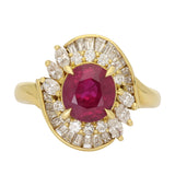 A glamorous vintage ring, centred with a vibrant oval cut ruby of rich red hue. The ruby is securely claw set and beautifully framed by an elaborate surround of diamonds, creating a dramatic asymmetrical cluster design.