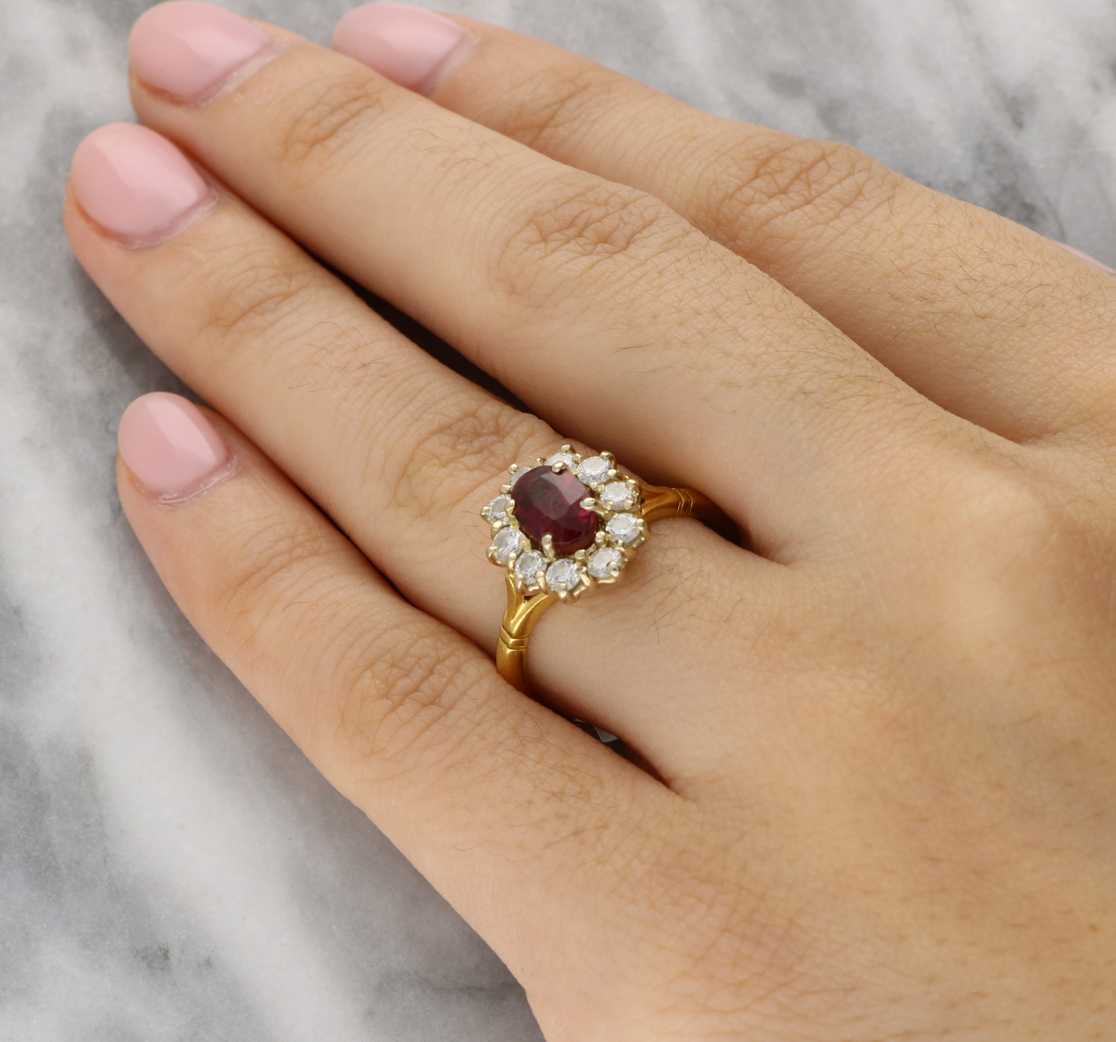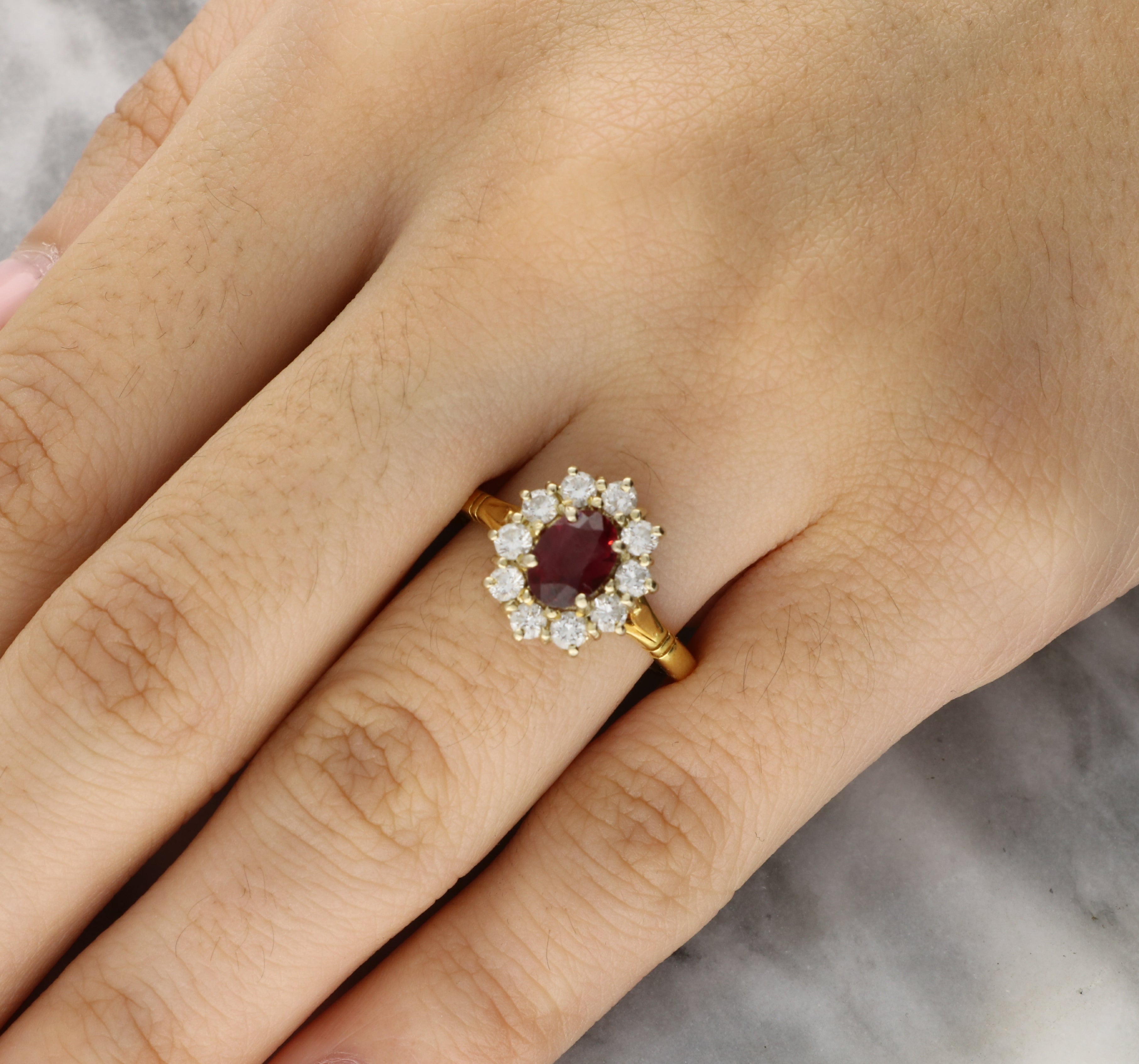 The ring is centrally set with a vibrant oval cut ruby, which is securely four claw set. The central stone is surrounded by a cluster of ten round brilliant cut diamonds which beautifully highlight the ruby, The head of the ring leads to a solid 18ct gold band.