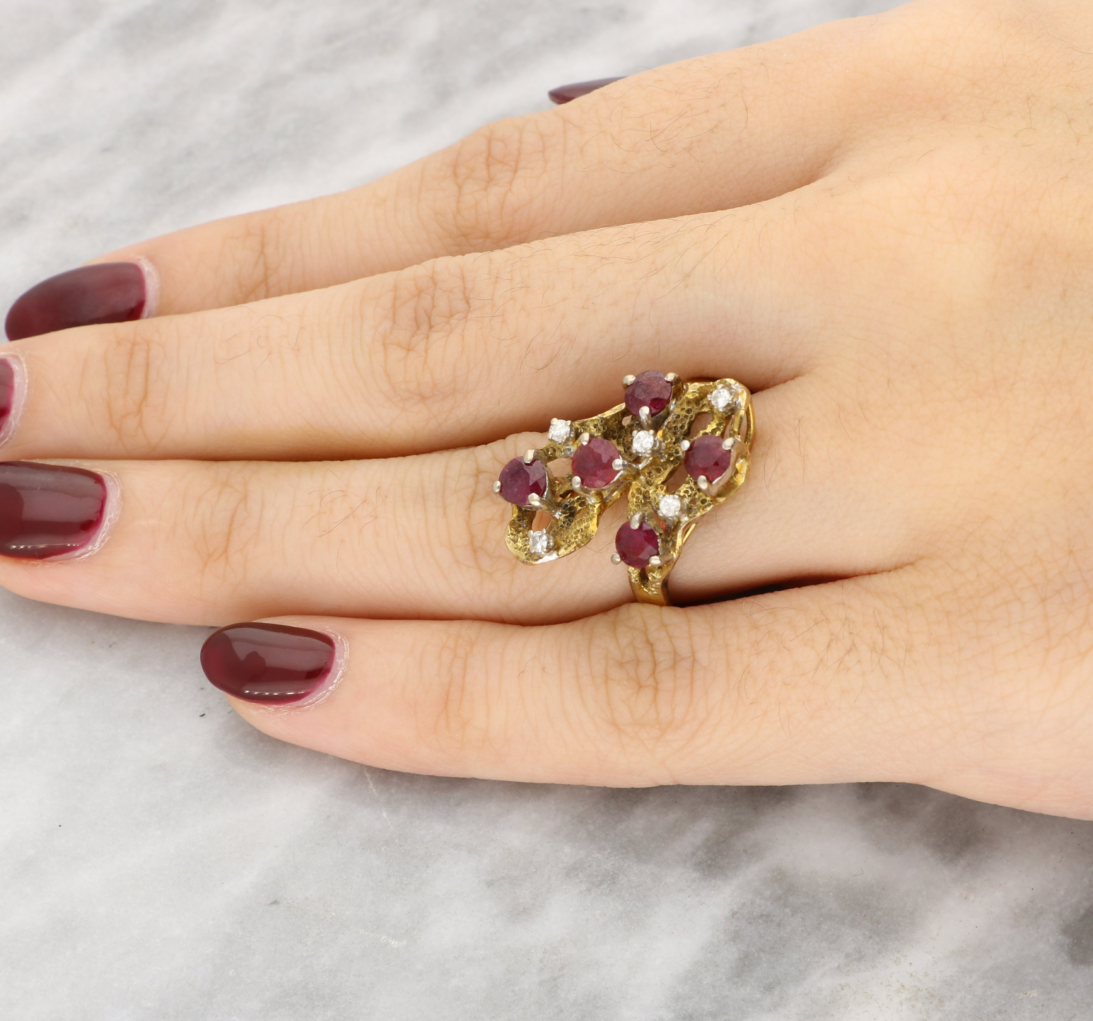 This beautiful ring is designed with an open, sculptural form that flows organically across the finger, finished with a richly textured surface that gives a handcrafted, almost molten appearance. Set throughout the design are round cut deep red rubies, accented by small round brilliant cut diamonds that add delicate flashes of light and contrast.