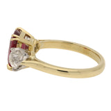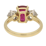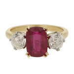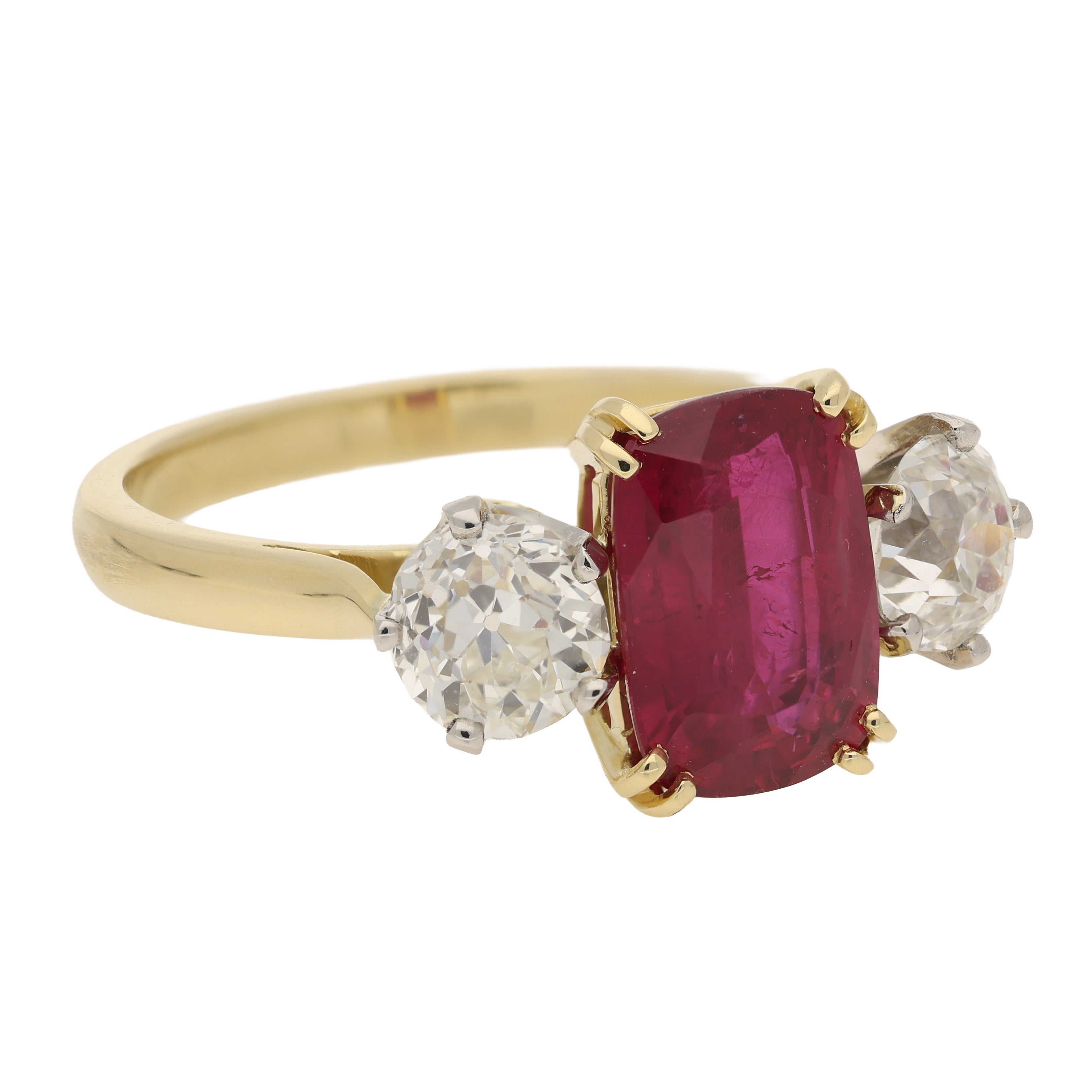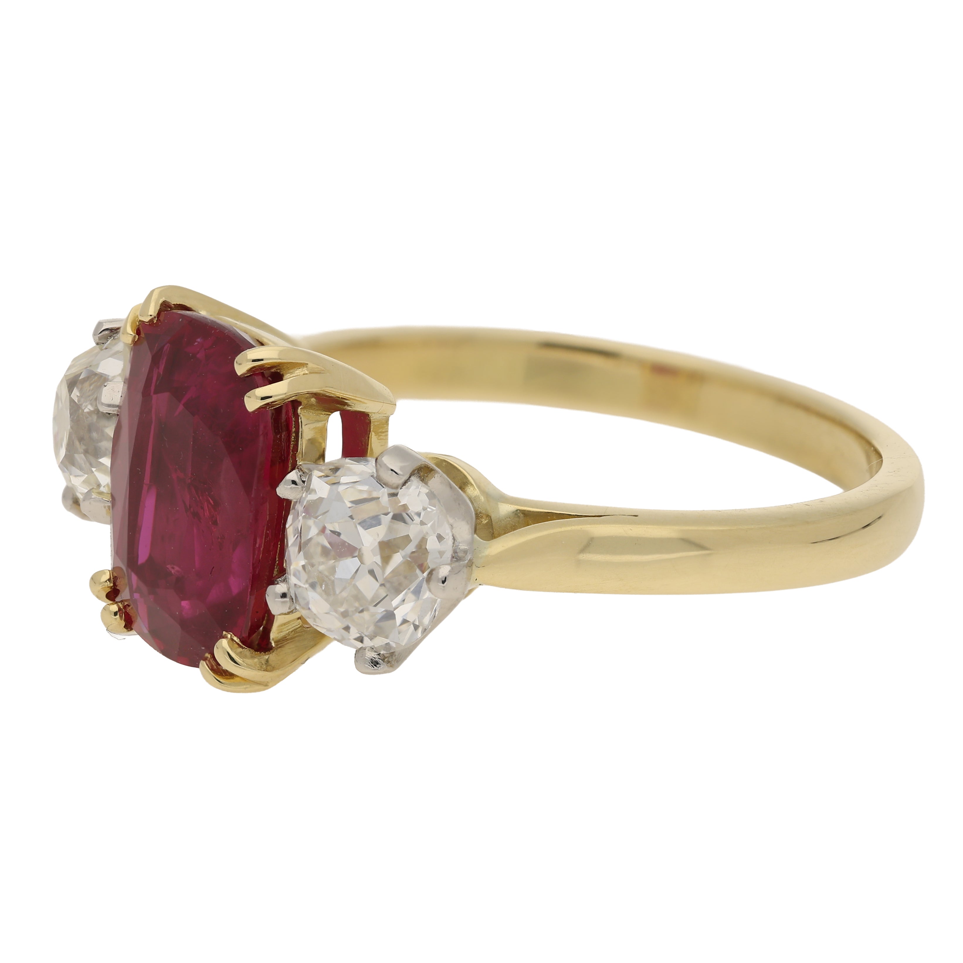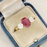 The ring centrally features a vibrant oval cut ruby, securely four claw settings. On either side of the rich red ruby is a old cut diamond, each claw set to complement and enhance the central stone.