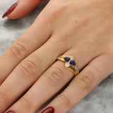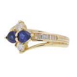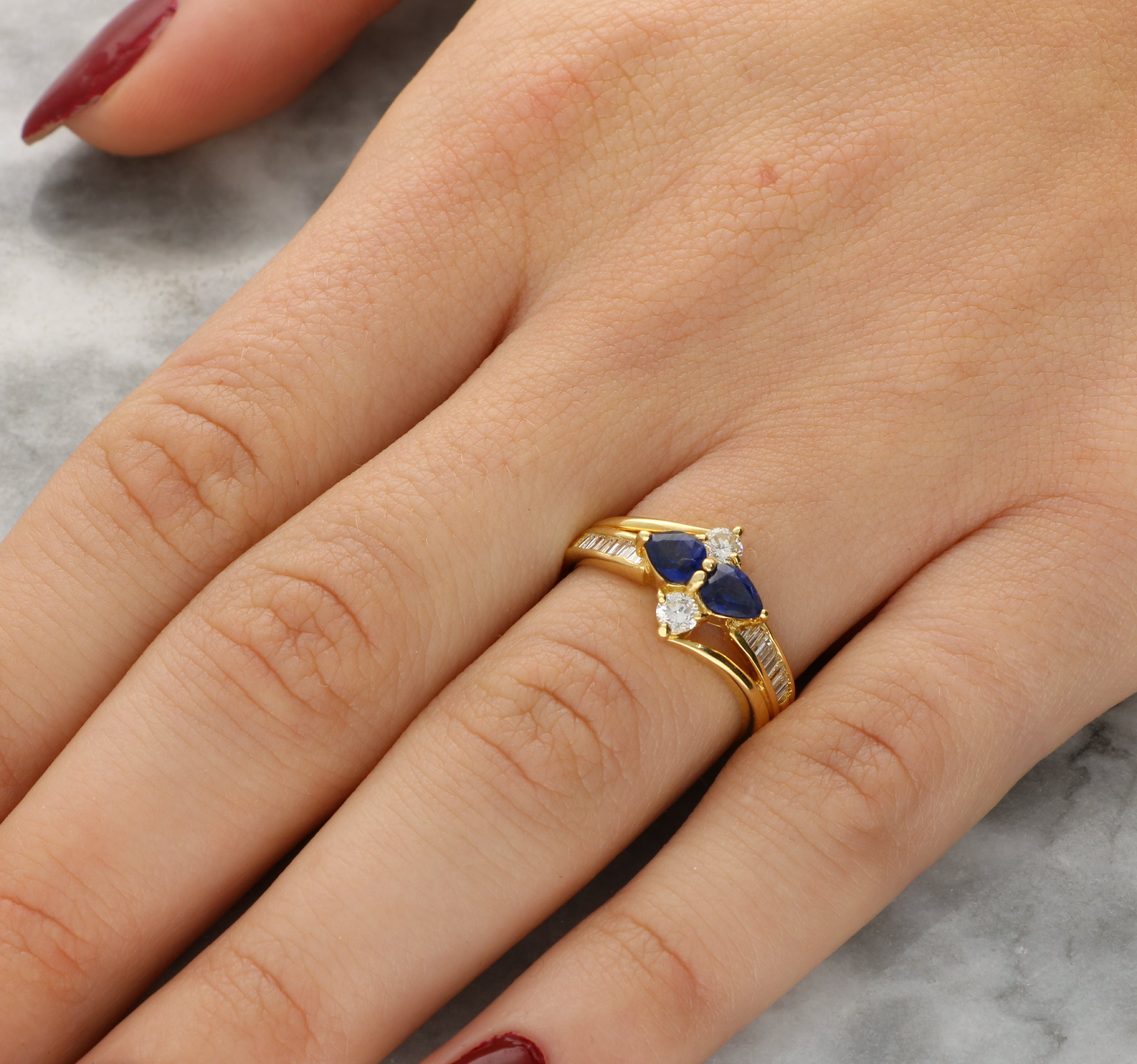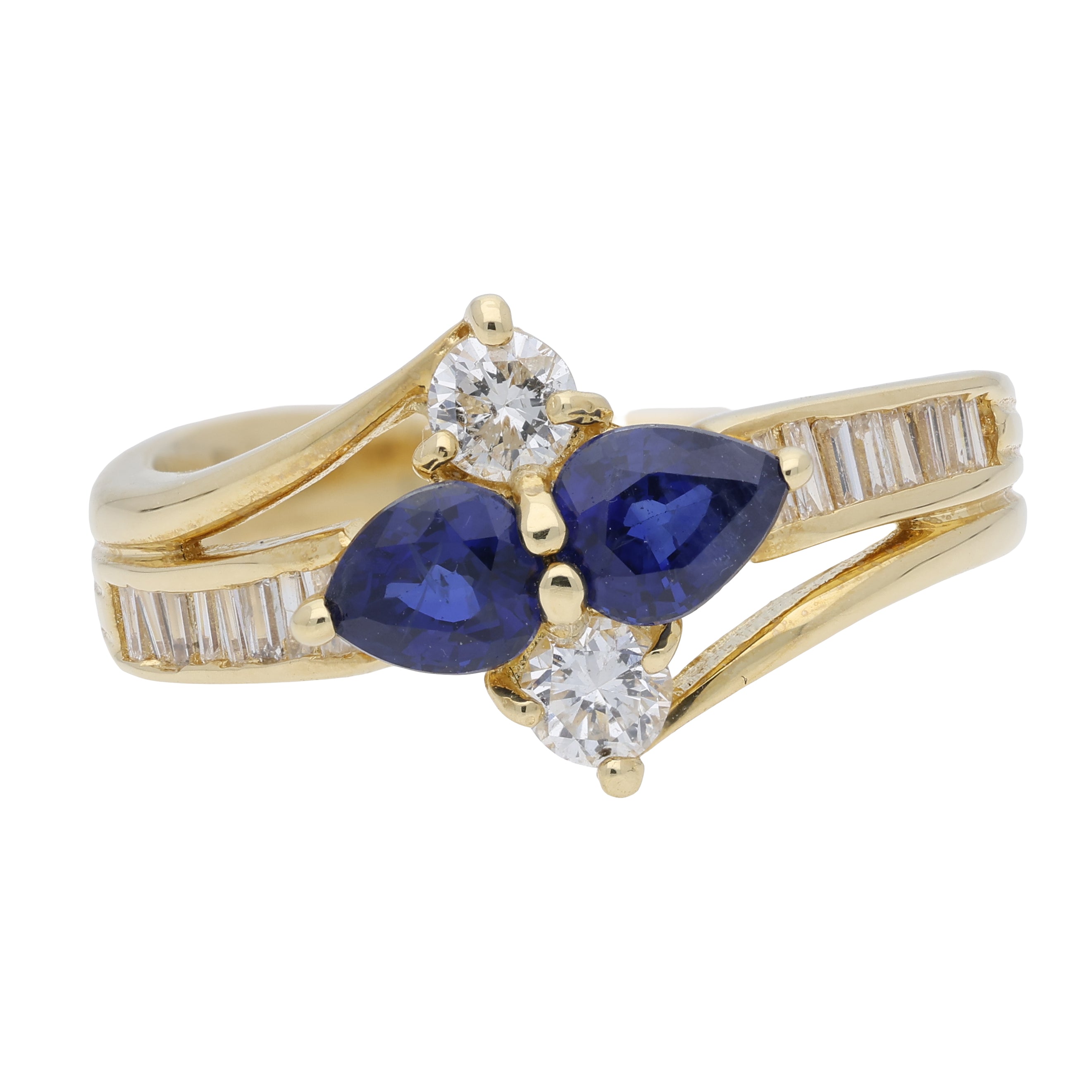 This ring is made in 18ct yellow gold and features a cluster of two pear cut sapphires set alongside two round brilliant cut diamonds at the centre. The stones are arranged in a balanced, slightly asymmetric layout that gives the ring a distinctive look. The split shoulders are set with rows of baguette cut diamonds, adding a subtle sparkle that frames the central stones. The head of the ring leads to a solid 18ct gold band.