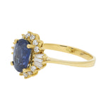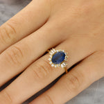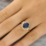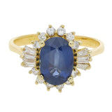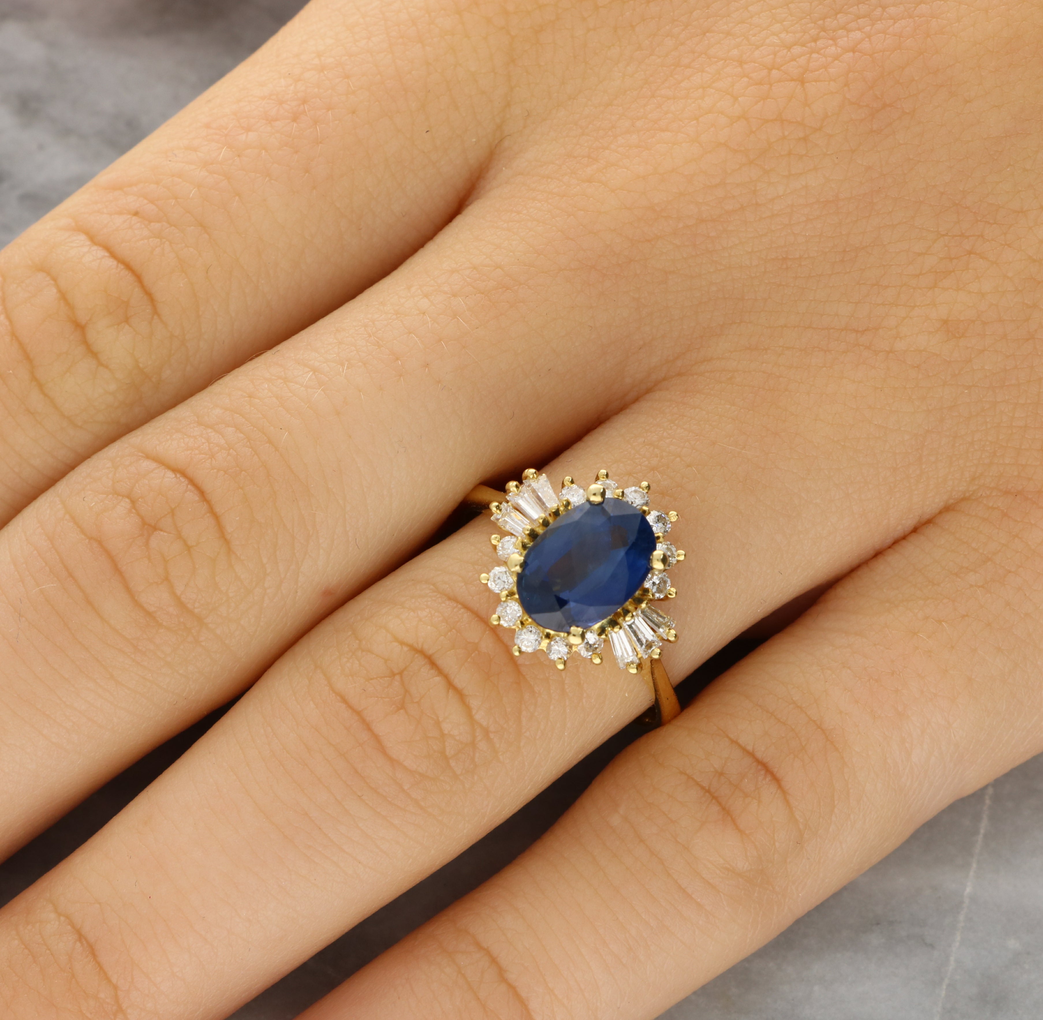 The ring features a central deep blue oval sapphire, securely four claw set, surrounded by twelve claw set round brilliant cut diamonds. At the top and bottom of the cluster are three baguette cut diamonds on each side, adding a clean, geometric touch that enhances the sapphire’s rich colour. The head of the ring leads to a solid yellow gold band, completing the elegant design.