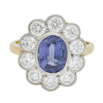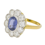 This vintage sapphire and diamond cluster ring features a stunning oval blue sapphire framed by a brilliant halo of sparkling round diamonds. Crafted in 18ct yellow gold with a contrasting platinum setting, it blends timeless elegance with exceptional colour and radiance.