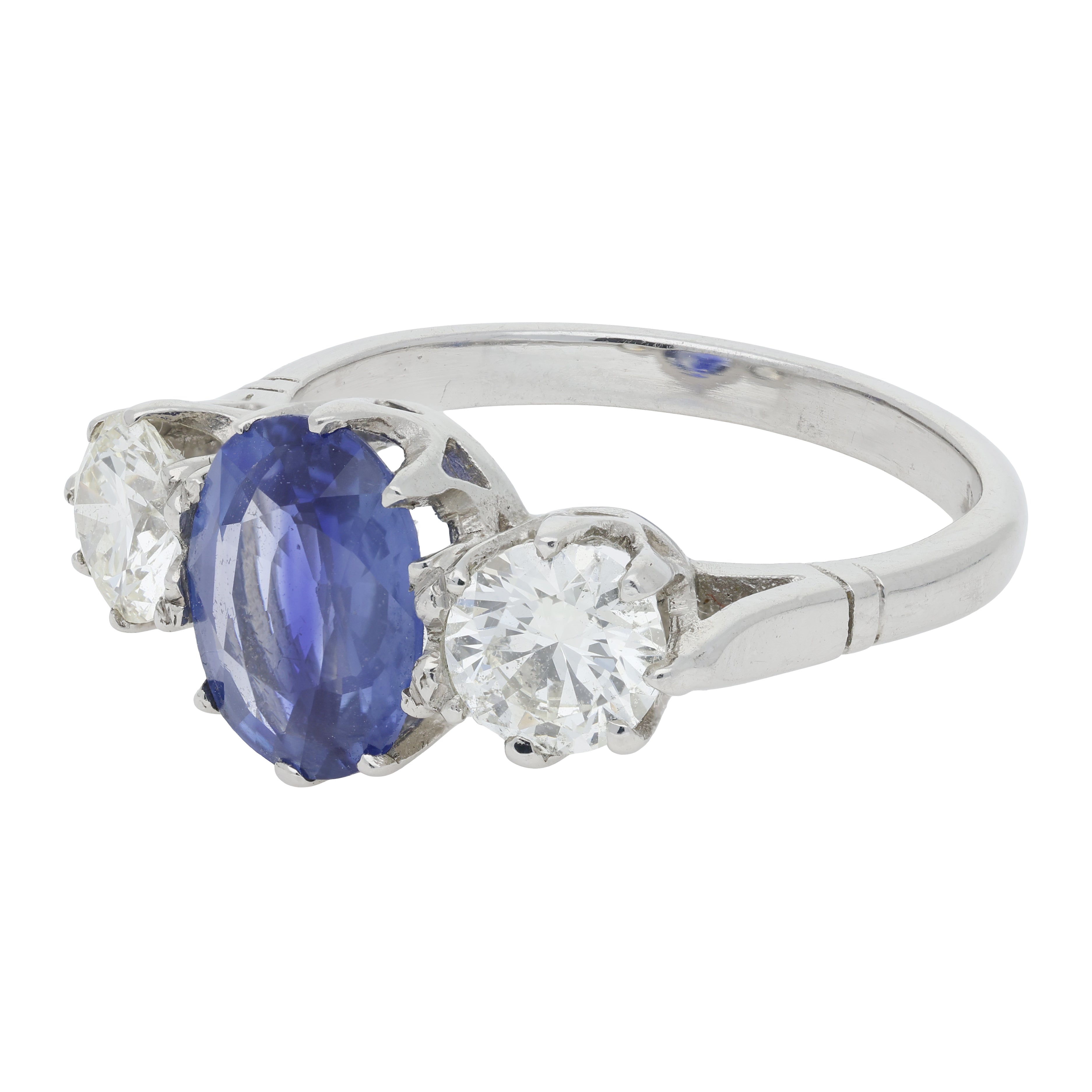 A beautiful vintage blue sapphire and diamond three stone ring set in platinum.