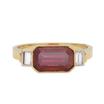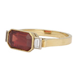 This striking ring features a rich emerald-cut No Heat Madagascar Orange sapphire set horizontally at its centre, framed in a fine milgrain yellow gold bezel. Flanked on either side by sleek baguette-cut diamonds in contrasting white settings, the clean lines and geometric composition create a refined, Art Deco–inspired aesthetic.