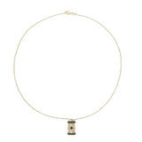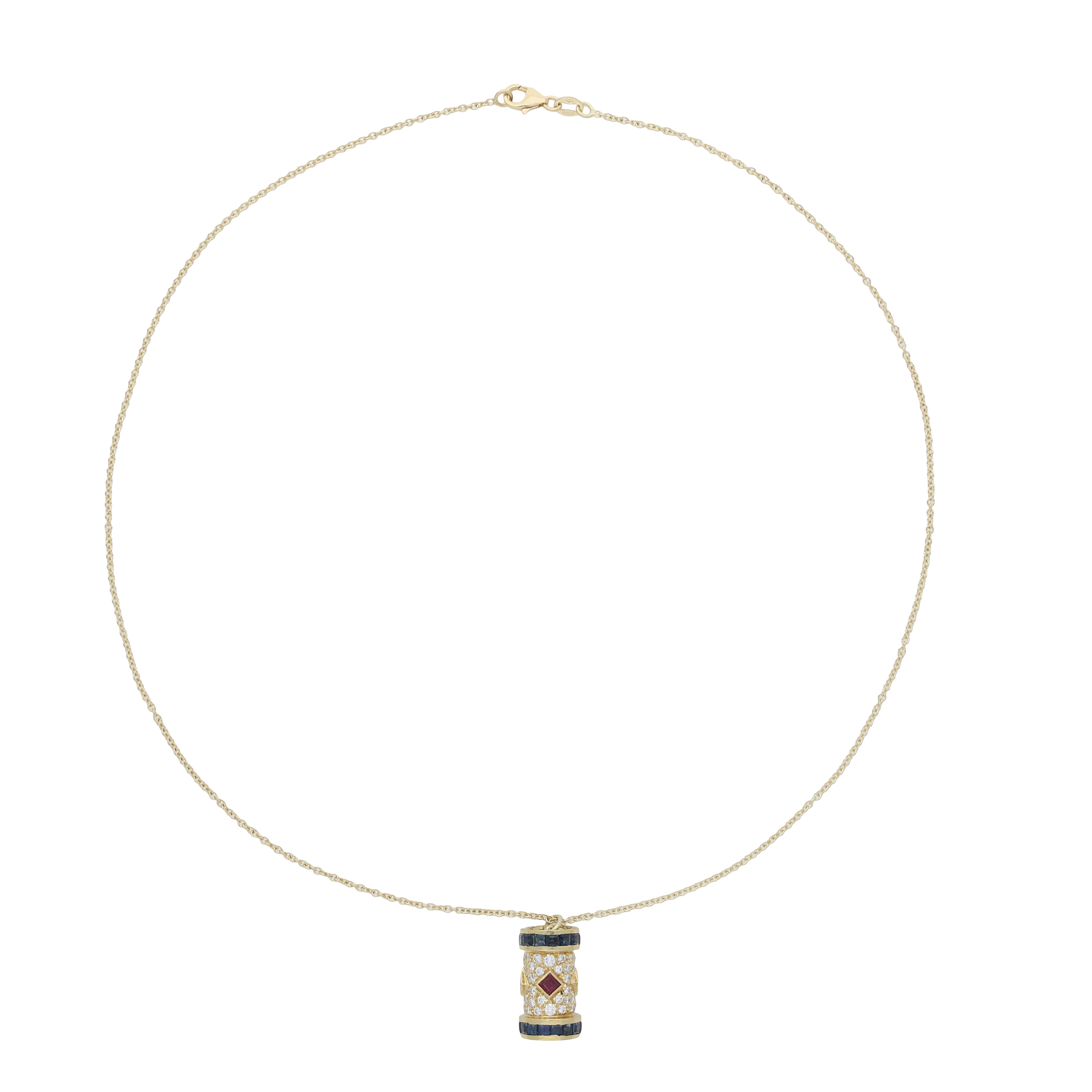This 18ct yellow gold pendant features a cylindrical design set with round brilliant cut diamonds across the centre. On opposite sides of the pendant sits a square cut ruby and a square cut emerald, each securely bezel set. The top and bottom edges of the pendant are finished with rows of calibre-cut blue sapphires. The pendant hangs from a matching gold bail and chain.