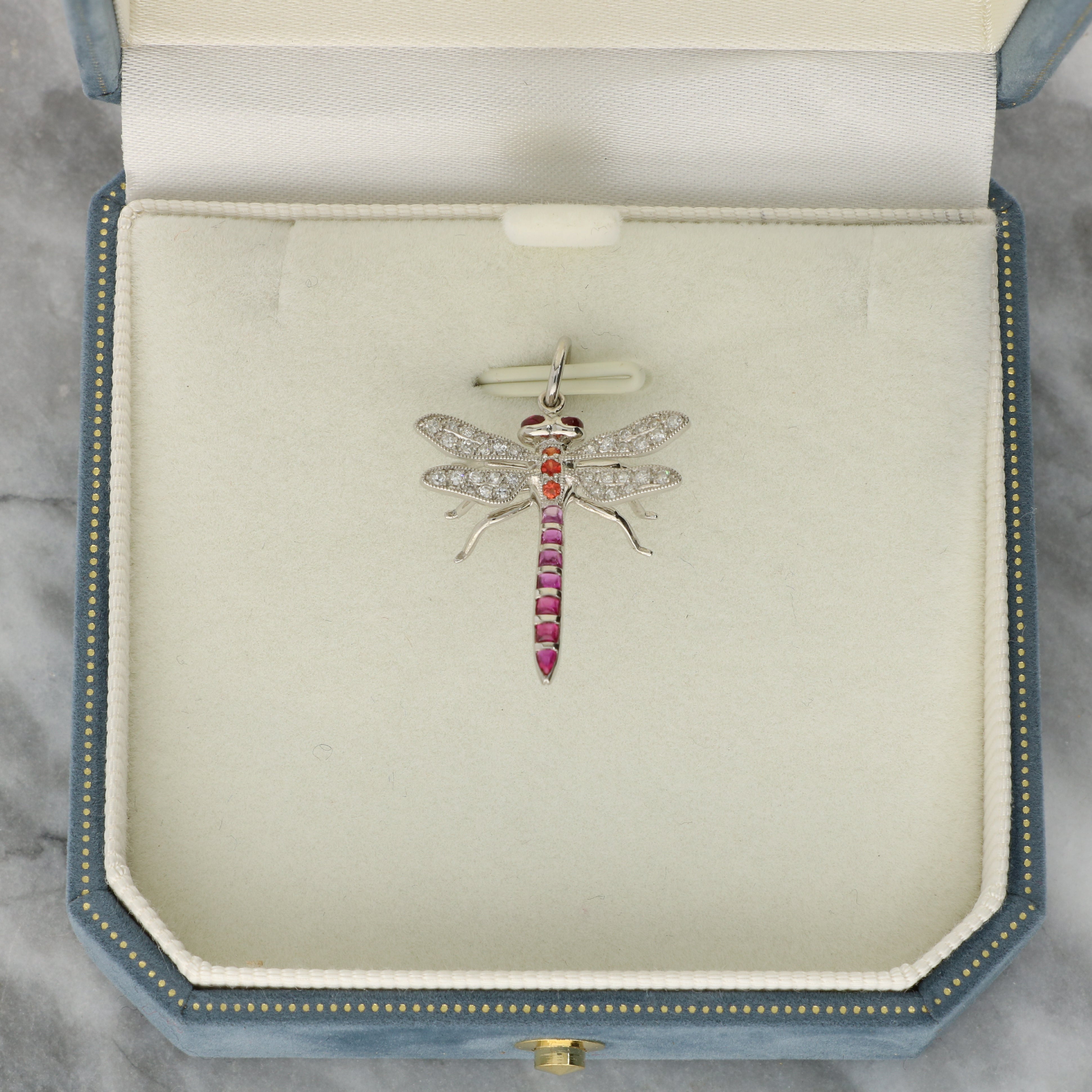 A vintage inspired ruby and diamond dragonfly insect pendant is adorned with ruby eyes and body, set in platinum.