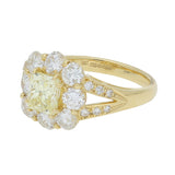 The ring is centrally set with a sparkly 1.01 carat radiant cut fancy yellow colour diamond which has been securely eight claw set. The radiant cut diamond is then surrounded by a cluster of 8 round brilliant cut diamonds. The head of the ring flows seamlessly into diamond-set split shoulders, which lead to a solid 18ct gold band.