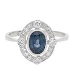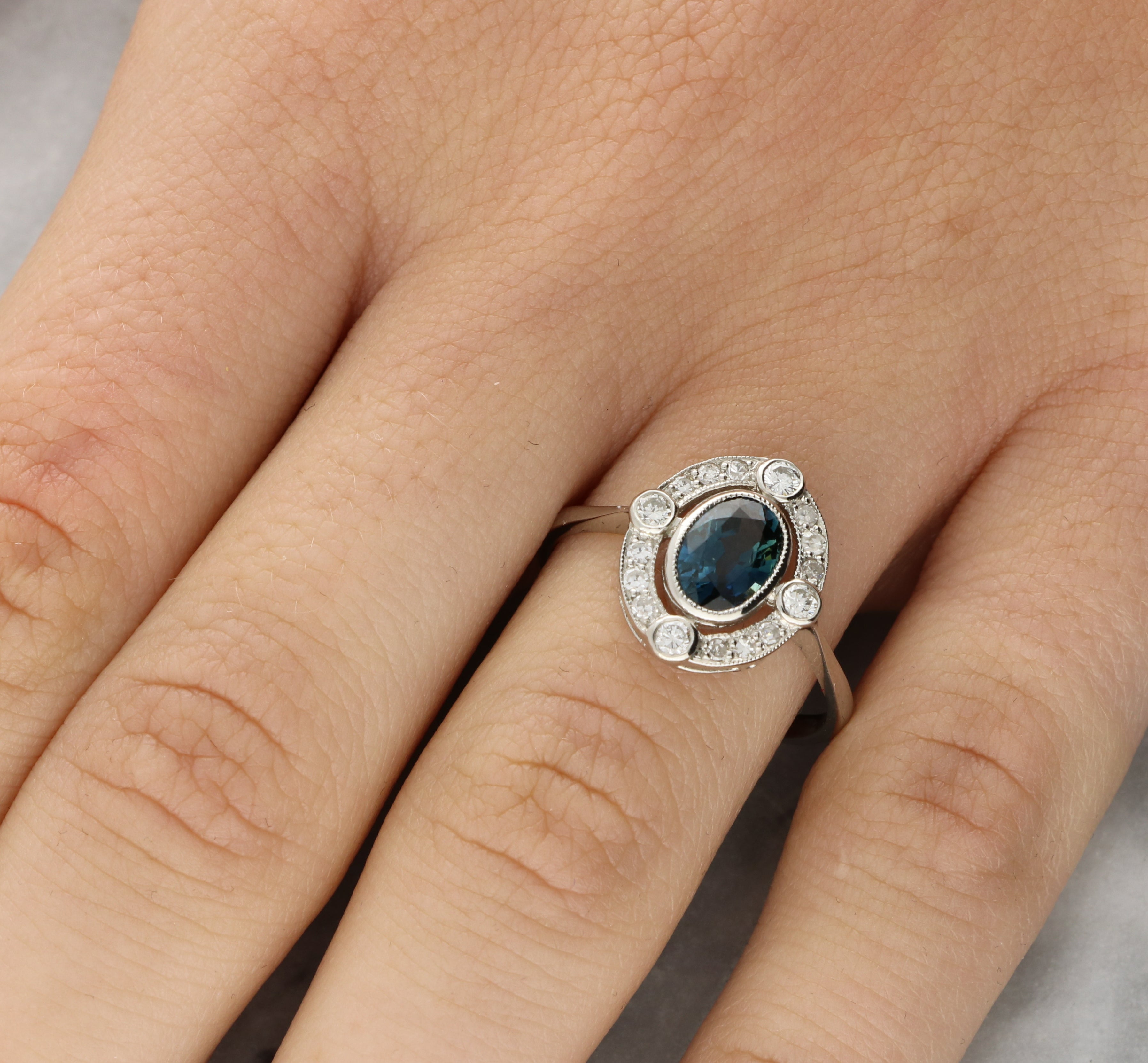 This beautiful ring features a centrally set oval teal sapphire, securely rubover milgrain set. Surrounding the sapphire is an intricate cluster of 16 round brilliant cut diamonds , with larger rubover set diamonds positioned at the top, bottom, and sides. The head of the ring flows into a solid platinum band.