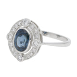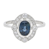 A vintage teal sapphire and diamond openwork cluster ring set in platinum.