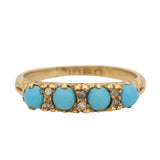 This charming ring is set with four round turquoise cabochons, each displaying a vivid sky blue hue. The stones are arranged in a line, and separated by two small round diamonds. The stones are set with 18ct gold claws, which are engraved with additional motifs.