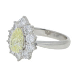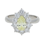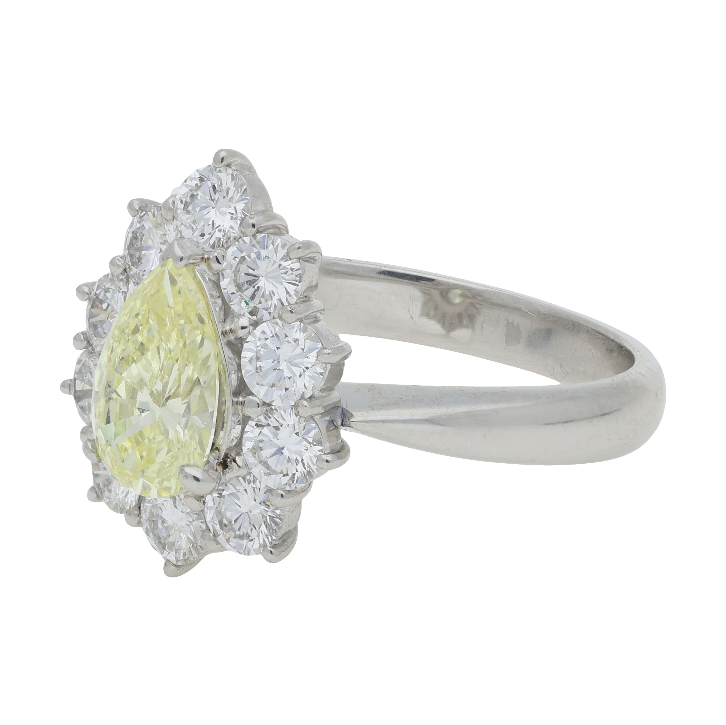 At the centre of the ring sits a vibrant pear cut yellow diamond, held securely by three claws. Surrounding the diamond is a cluster of ten sparkling claw set round brilliant cut diamonds that enhance the colour and brilliance of the centre stone. The head of the ring leads into a solid tapered platinum band.