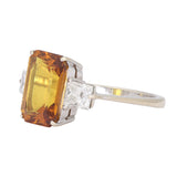 This elegant three stone ring features a vivid emerald-cut yellow sapphire at its centre, held securely in 18ct white gold, classic claw setting. The yellow sapphire has a warm golden hue, making it a striking focal point. A pair of princess cut diamonds sits on either side of the sapphire enhancing the colour through the contrast.