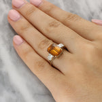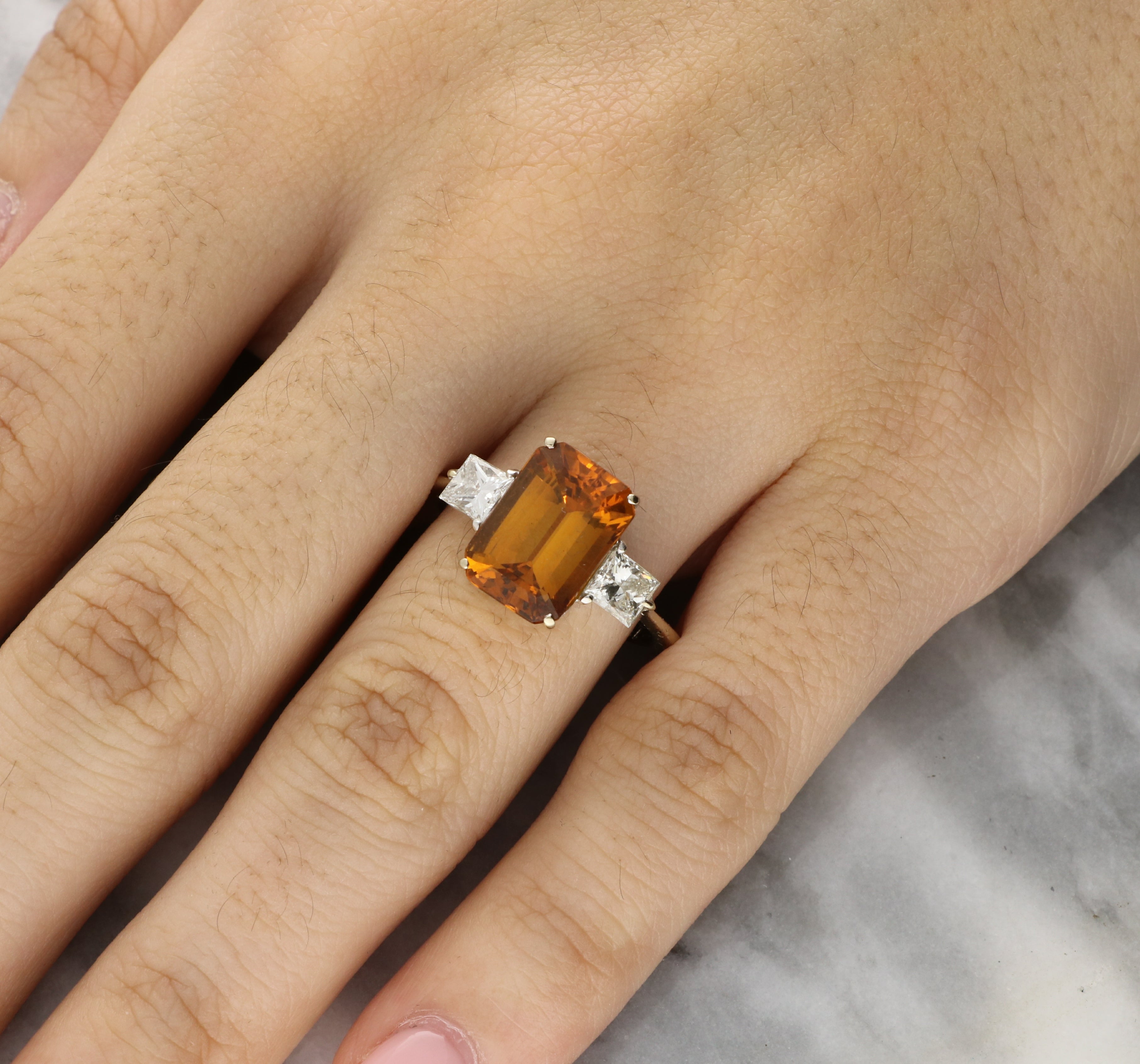 - Stone Weight: The central yellow sapphire has been certified as 5.64 carats, Orangey Yellow in Colour and Lightly Included in Clarity (WGI Certificate Number: WGI9634165638). There is a combined side diamond estimated weight of 0.88 carats, G-H in colour and VS1-SI2 in clarity.