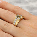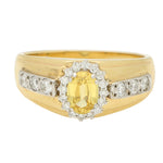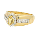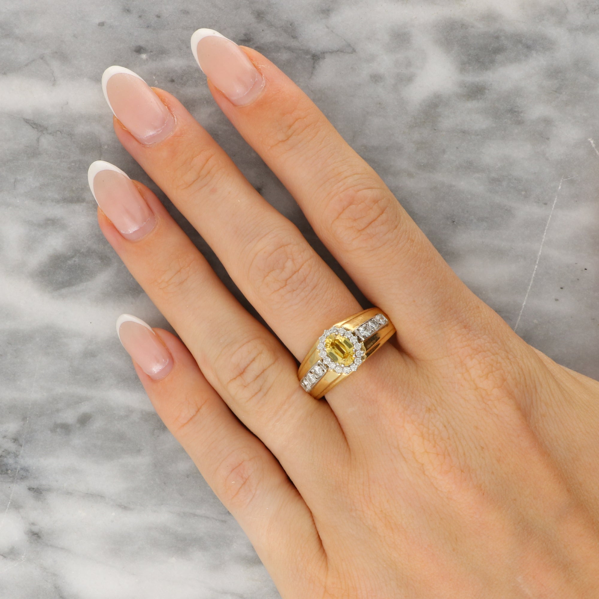 The ring is composed of a chunky yellow gold band set to the centre with an elegant cluster. The cluster is composed of an oval cut yellow sapphire, surrounded by claw set round brilliant cut diamonds. The diamonds continue down the sides of the chunky gold setting leading to a solid gold band.