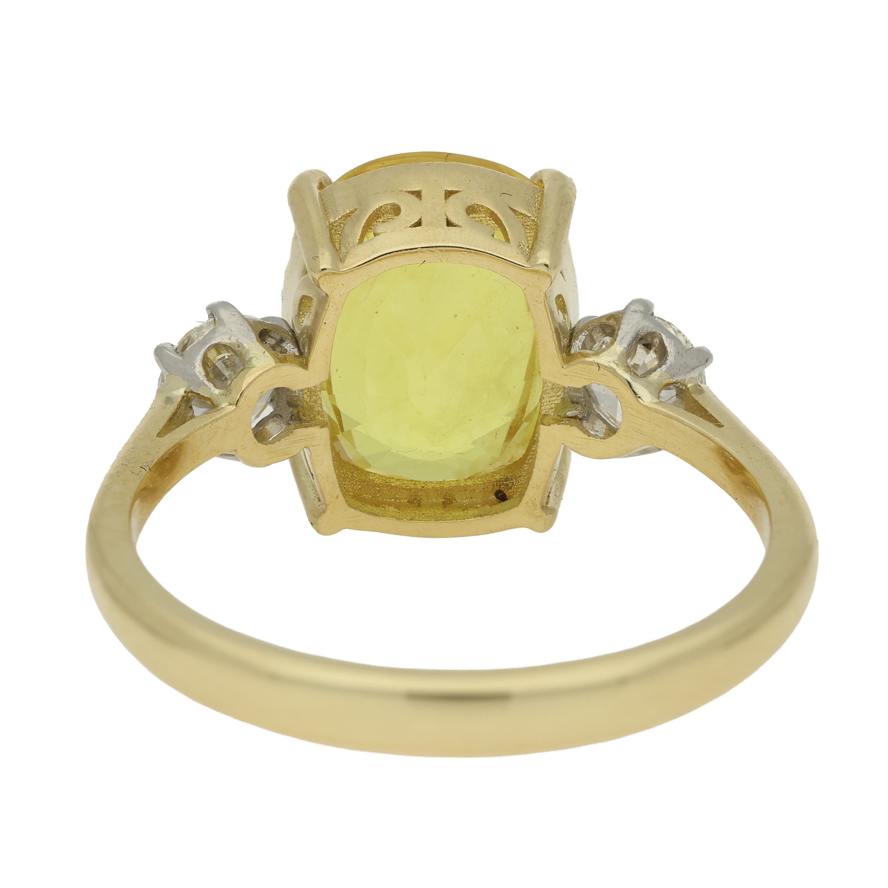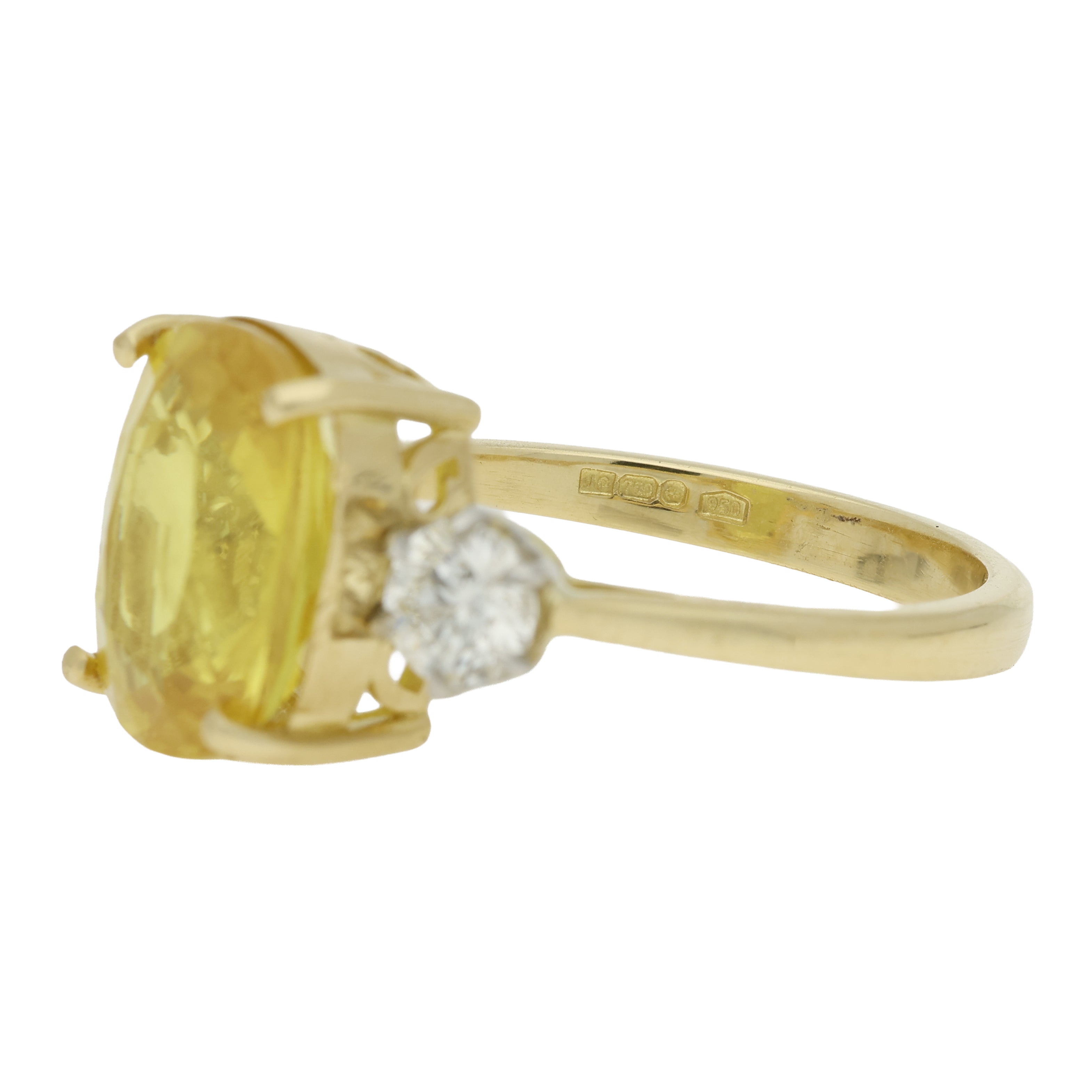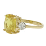 This elegant three stone ring features a vivid cushion-cut yellow sapphire at its centre, held securely in a yellow gold, classic claw setting. The sapphire has a warm golden hue, making it a striking focal point. A pair of diamonds sits on either side of the sapphire enhancing the colour through the contrast.