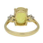 - Stone Weight: The central yellow sapphire has an estimated weight of 4.18 carats. There is a combined side diamond weight of 0.42 carats.